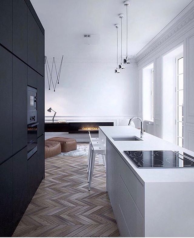 블랙 & 화이트로 꾸민 주방에 헤링본 바닥이 예쁜 포인트가 되었네요.