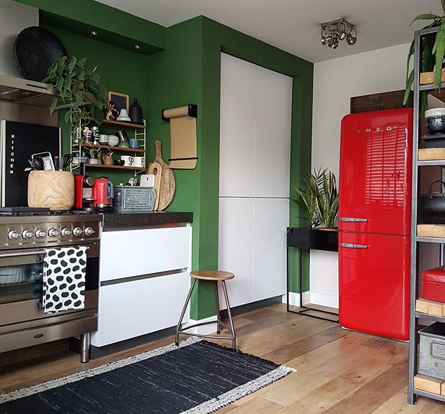 선명한 녹색 벽면에 톡톡 튀는 붉은 냉장고가 포인트가 된 주방입니다.