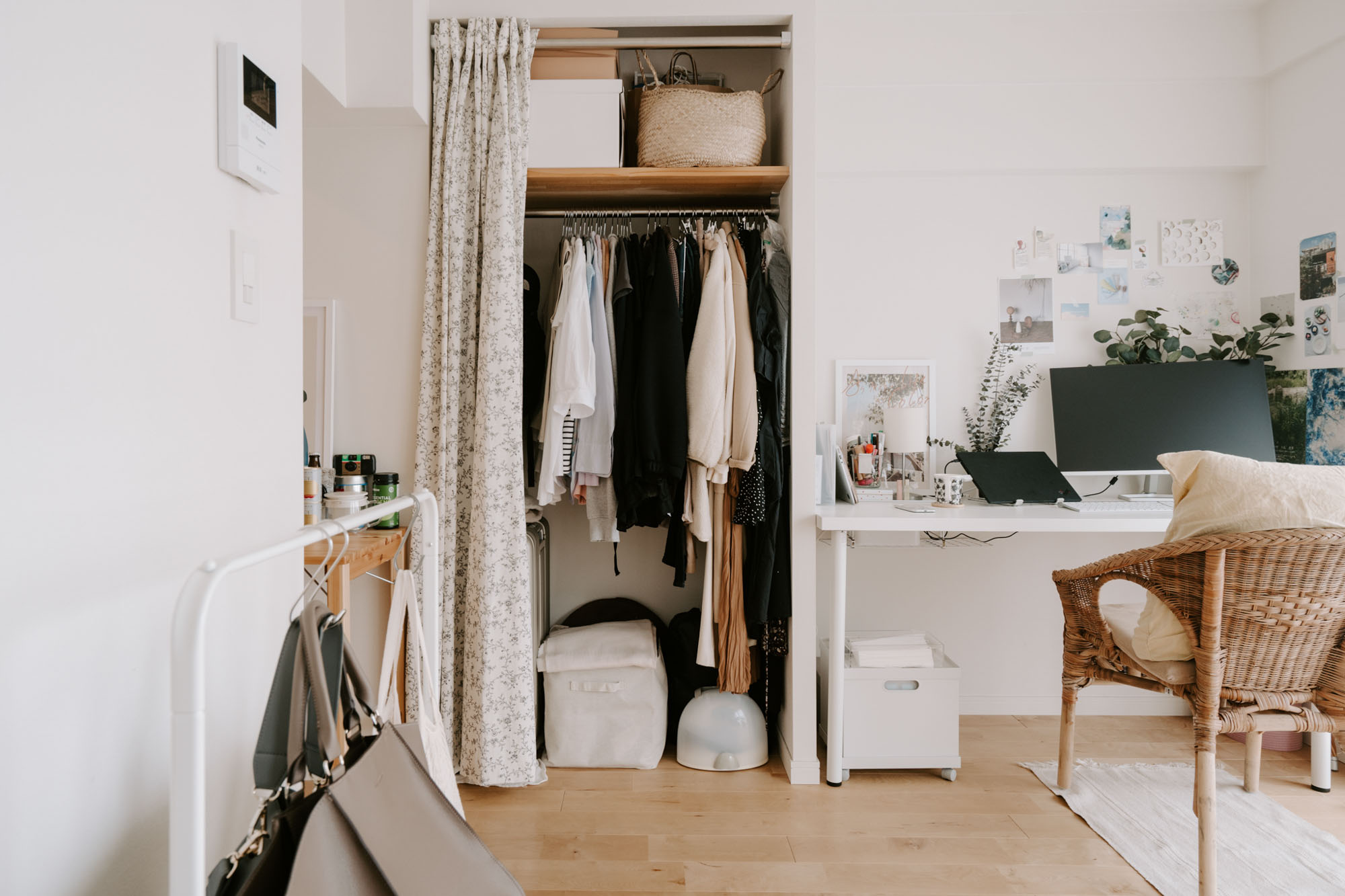 수납공간은 이렇게 따로 마련되어 있는데 커튼을 이용하여 지저분하지 않게 가렸어요. 너무 좁은 게 아쉽긴 하지만 그만큼 물건들이 늘어나지 않아 좋은 점도 있다고 하네요.