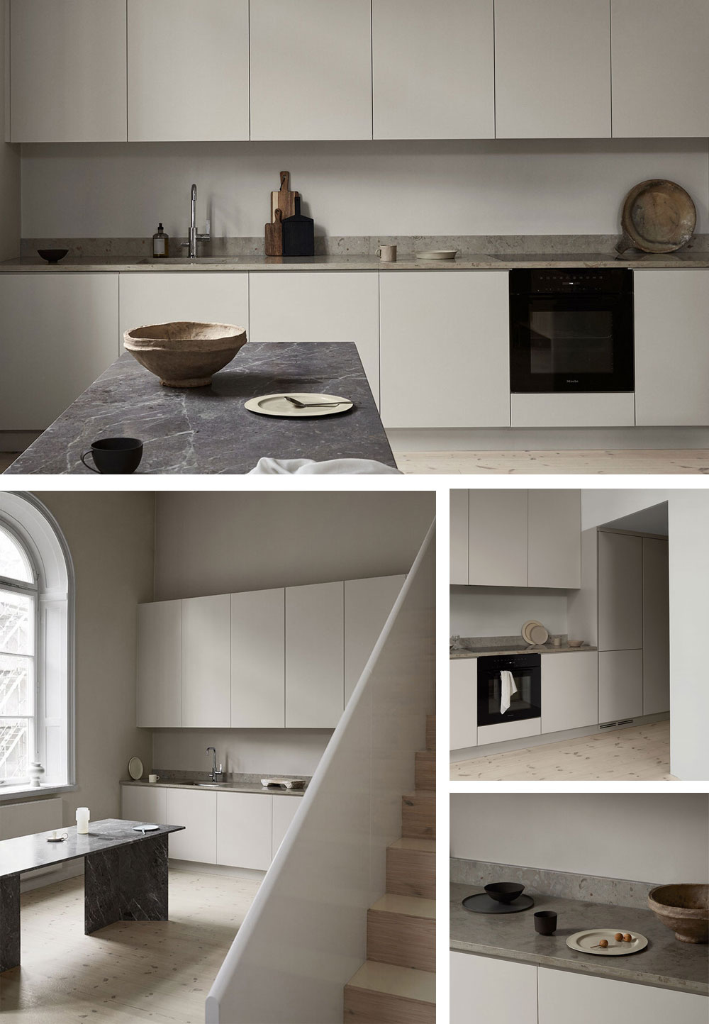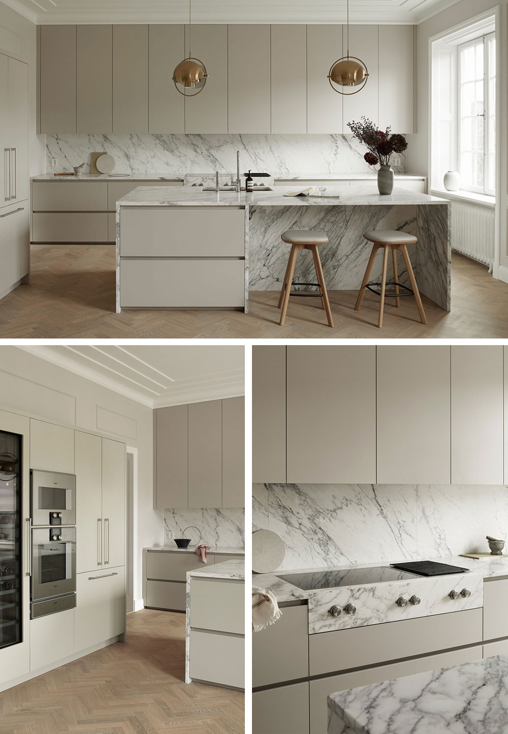 맞춤형 미니멀 주방은 스톡홀름의 쇠데르말름에 있는 아파트의 주방입니다. 벽과 같은 섬세한 그레이 톤으로 칠해져 나무 바닥과 미묘하지만 우아한 대조를 이룹니다.손잡이를 제거하고 모든 수납장을 같은 너비로 만들어 공간을 매끄럽고 대칭적인 라인으로 구성했습니다. 도어 상단의 숨겨진 손잡이,빌트인 냉장고 및 냉동고는 단순하고 매끄럽게 연출하였습니다.