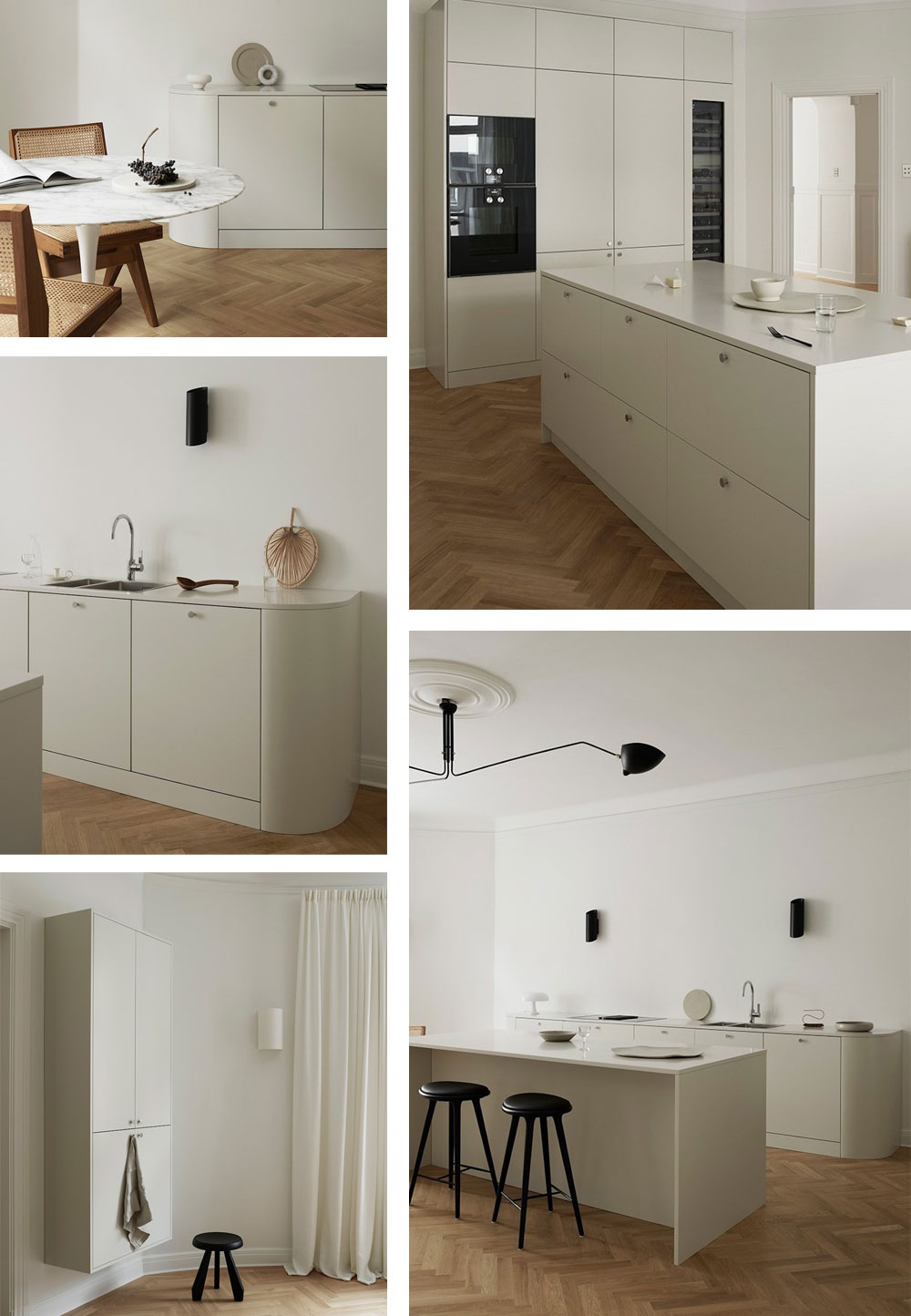 스톡홀름의 호화로운 주거 지역인 Östermalm의 유서 깊은 아파트에 위치한 미니멀한 주방은 고급스러운 톤온톤 팔레트가 디자인의 아름다운 심플함을 더욱 돋보이게 하여 따뜻하고 고요한 분위기를 연출합니다. 블랙의 몇 가지 세부 포인트를 적절하게 대비하였으며 싱크의 둥근 모서리는 클래식한 곡선형으로 독특하고 유기적인 형태가 부드러움을 더해줍니다.