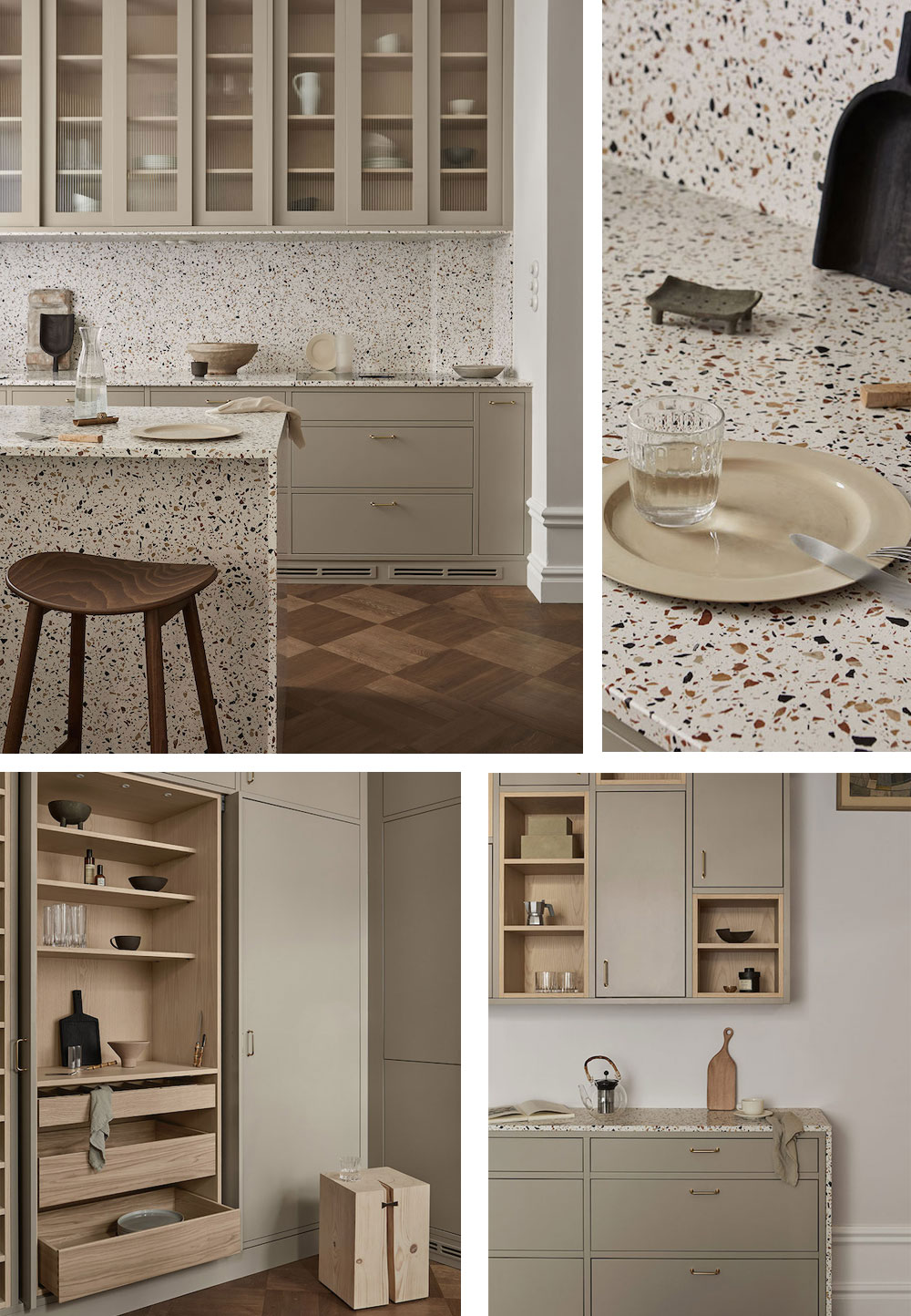 싱크대와 벽면, 아일랜드는 같은 테라조로 연결하여 매력적이며 세련된 모습입니다. 원목마루 바닥과 황동 손잡이가 따뜻함을 더합니다.