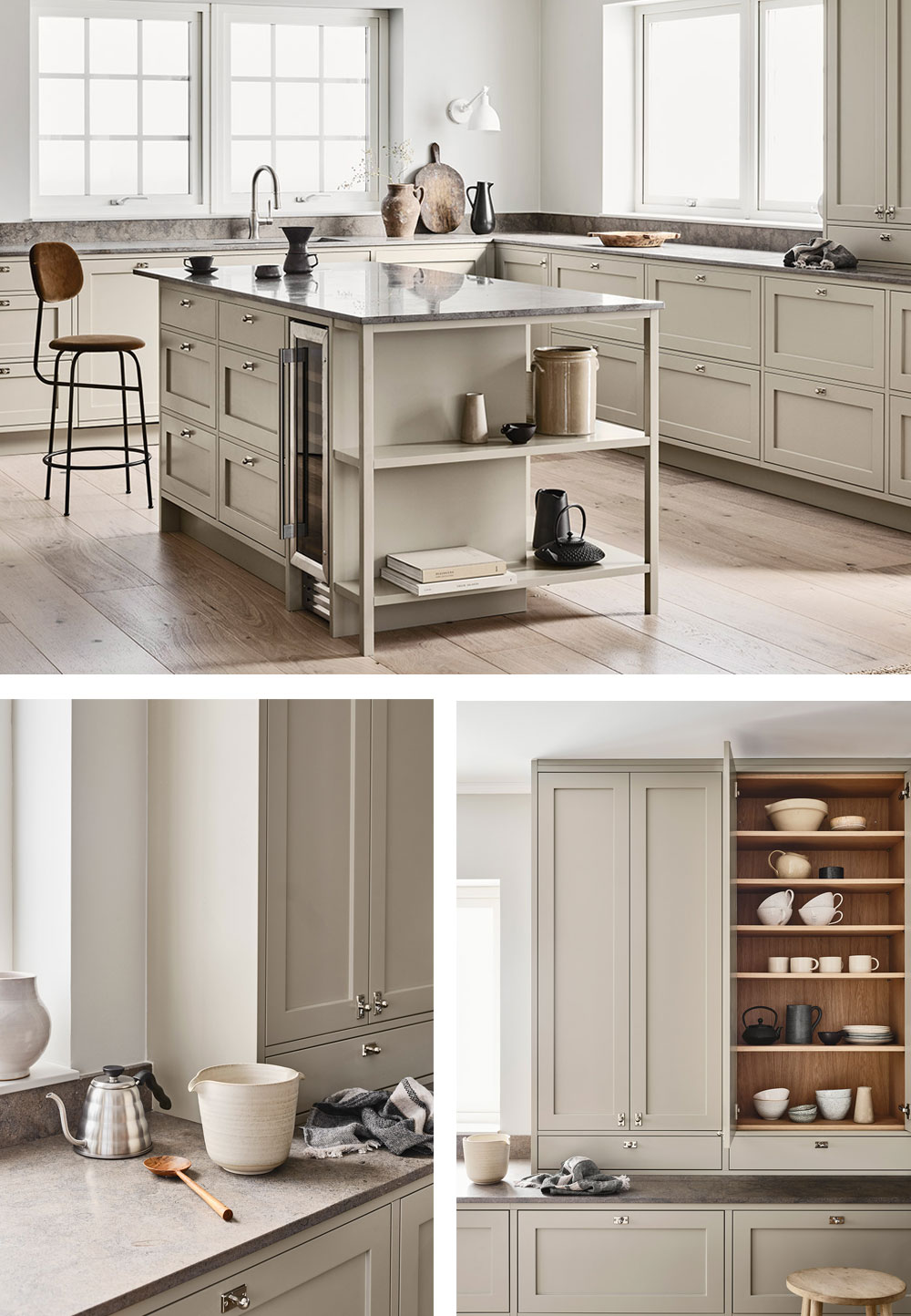 이 아름다운 맞춤형 주방은 밝은 북유럽의 스칸디나비아의 인테리어에서 영감을 받았습니다. 부드럽고 차분한 라이트 그레이 톤이 석회암 조리대와 조화로운 모습입니다. 문과 서랍을 열면 오크로 제작된 맞춤 수납장을 볼 수 있습니다. 주방 아일랜드 끝부분에 오픈선반을 설치하여 요리책과 소품을 진열하고 싶은 분들에게 좋은 아이디어가 될 것 같습니다.
