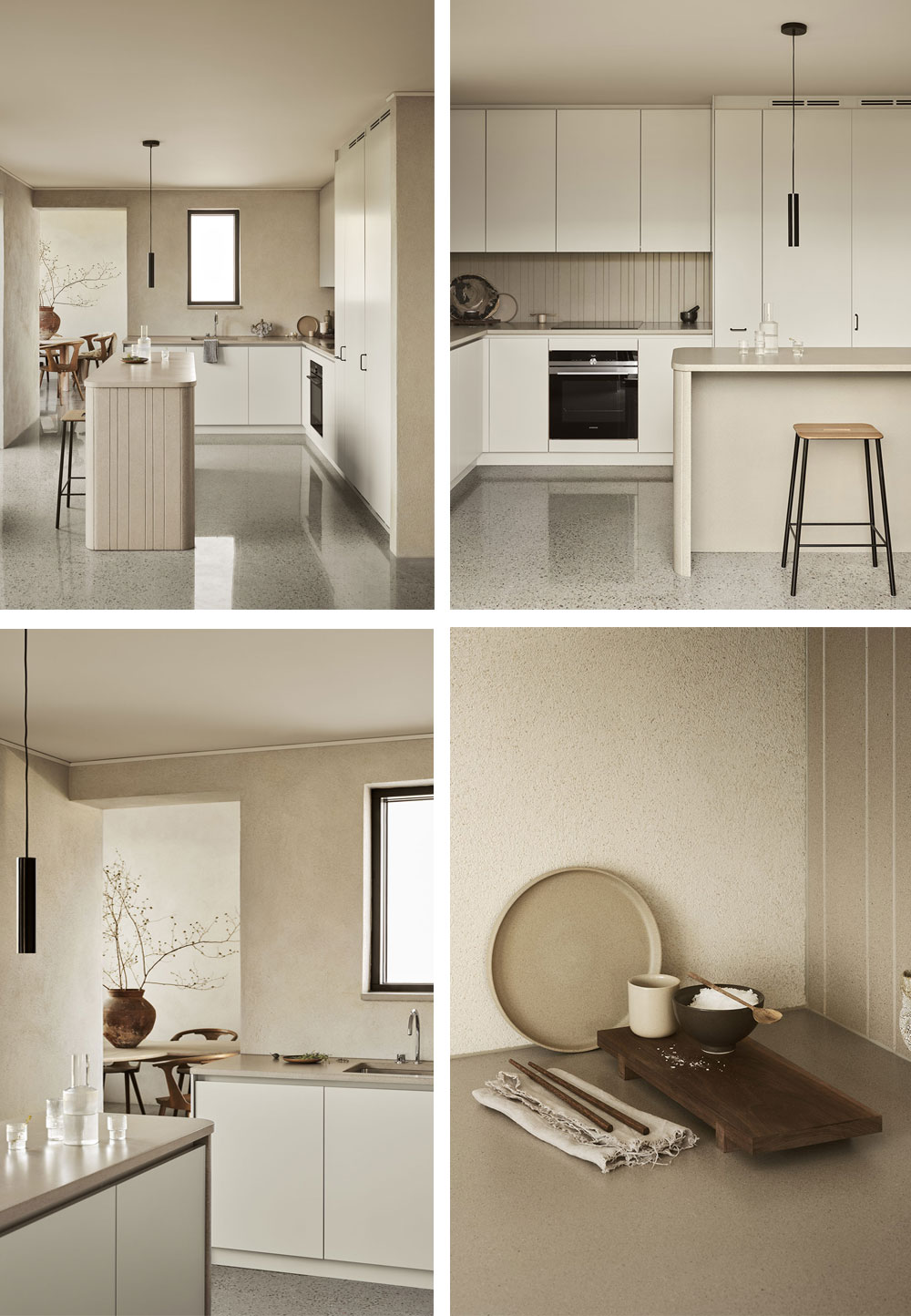 따뜻한 라이트 그레이 톤은 전체 공간의 세련된 색상으로 작용합니다. 벽, 문 및 손잡이는 모두 같은 색상으로 칠해져 있으며 블랙 디테일은 주방의 부드러움과 매끄러운 대조를 만들어 우아한 역동성을 연출합니다. 반대쪽 벽에는 추가 수납 공간이 있어 스타일리시하고 맞춤형으로 잘 연출하였습니다.