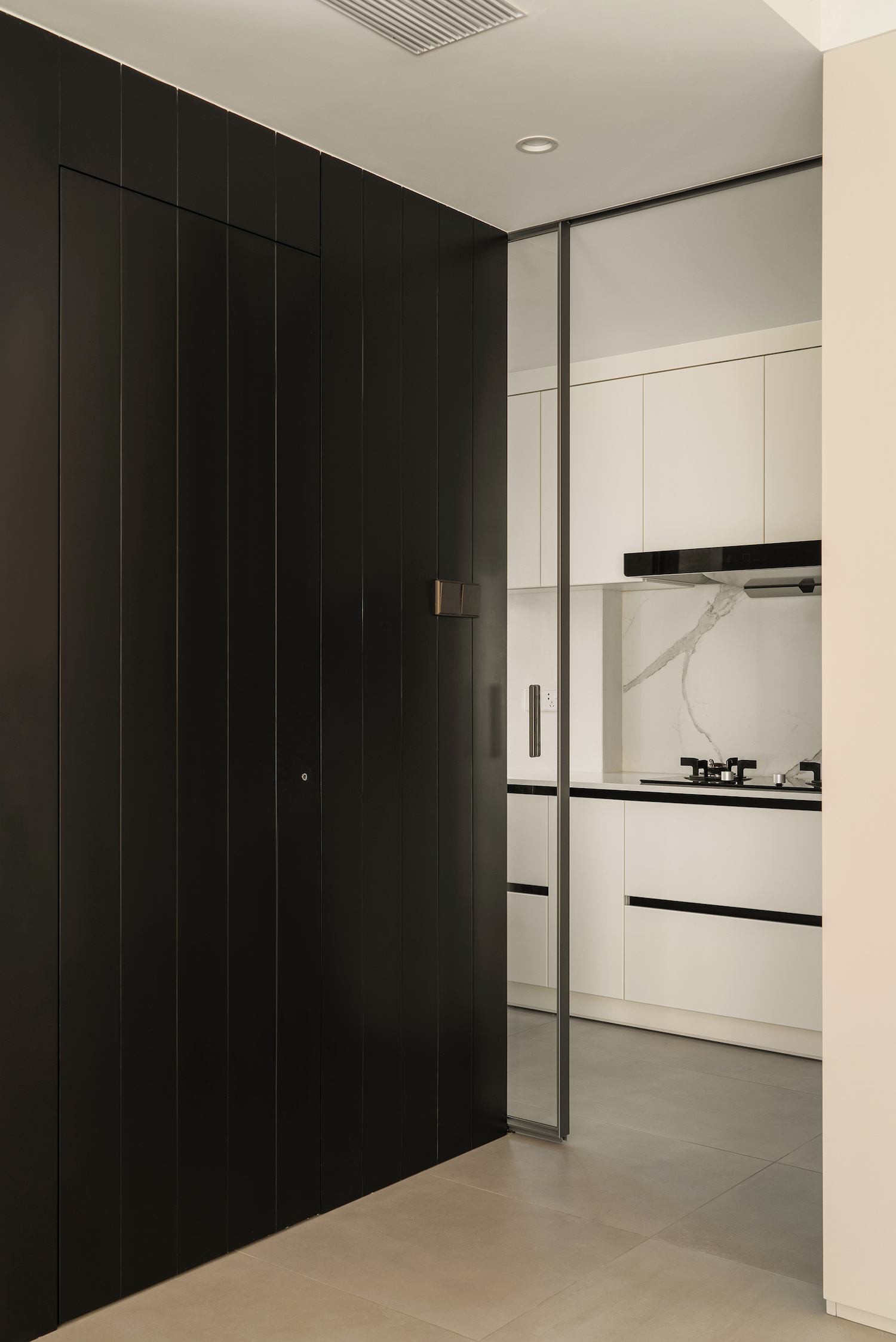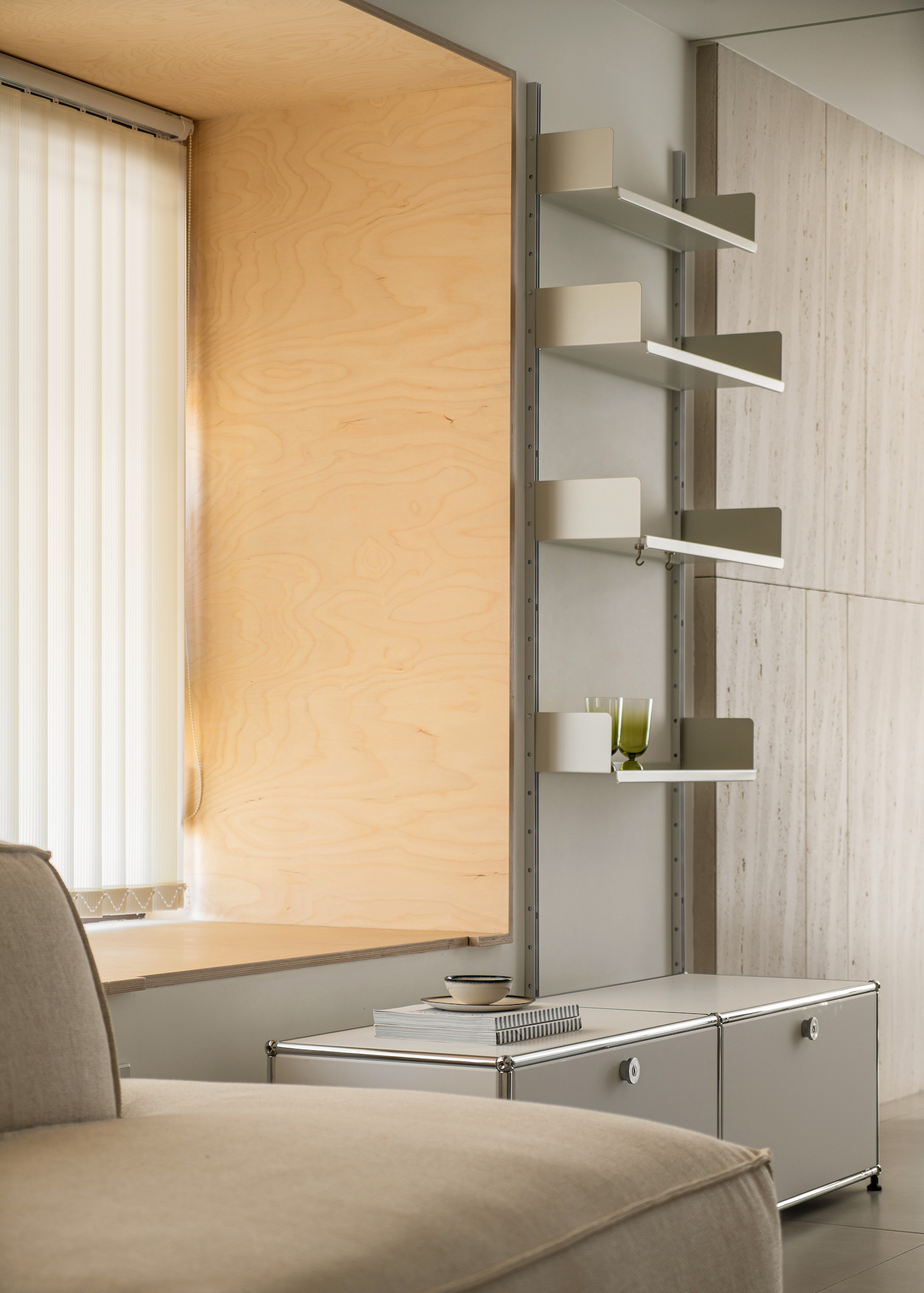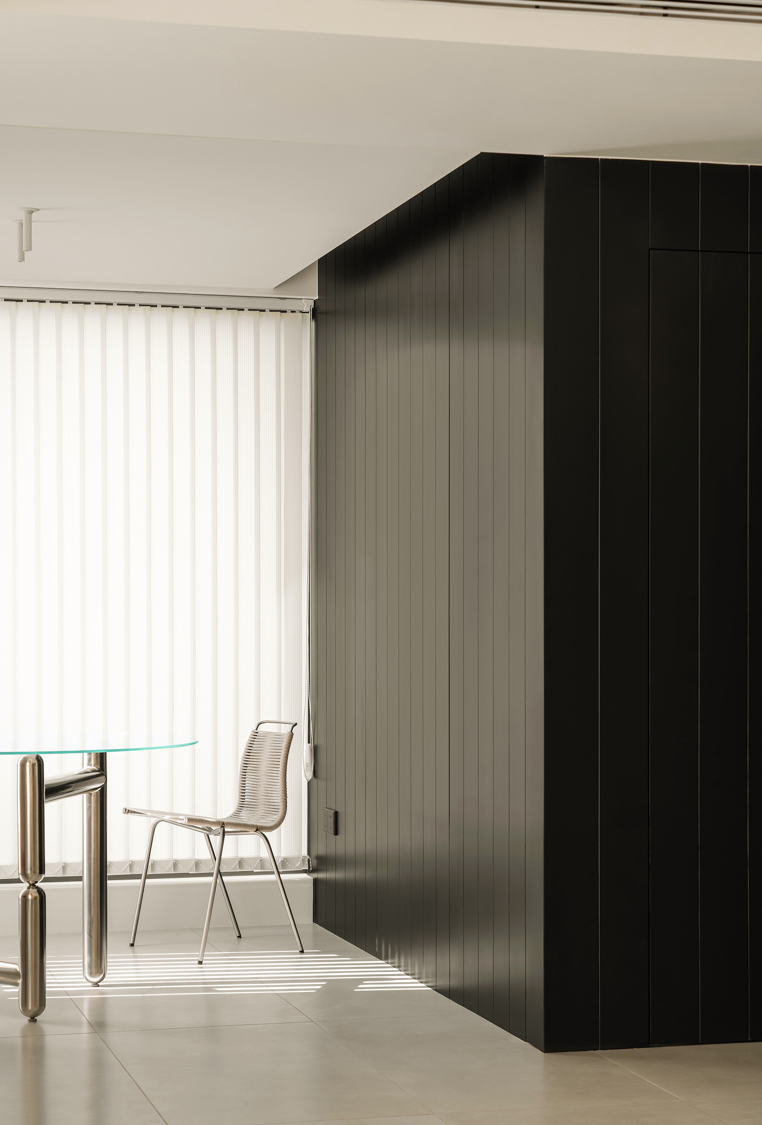 커튼을 펼치면 푸르른 산이 보이는 이 곳은 창의 자작나무 소재를 통해 오후 햇살이 반사되어 공간 전체를 옅은 노란색으로 물들여 여유로운 분위기를 연출합니다. 파사드 소재는 블랙, 그레이, 우드 3가지 주요 색상으로 구성되어 다양한 기능 영역을 분할하고 빌트인 가구로 숨겨진 수납 공간이 외부 청결을 유지하도록 설계되었습니다.