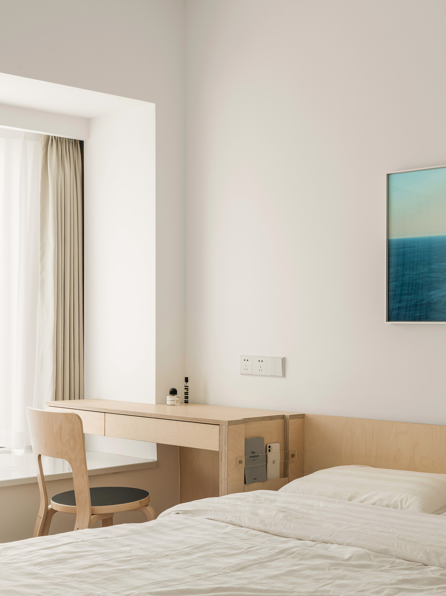 침실 또한 자작나무 소재를 사용해 따뜻한 분위기를 연출하고 있으며 창이 나있는 공간의 맞춤가구와 테이블과 침대헤드를 높이를 일정하게 두어 더욱더 깔끔하게 연출한 모습입니다.